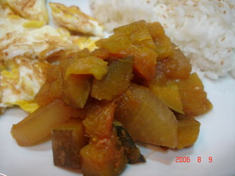 3.南瓜和白羅蔔都熟後,去水分放入鍋中加入高湯並加入醬油和糖一起燉煮至湯收乾